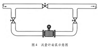(6)安裝在工藝不允許流量中斷的管道時,應(yīng)考慮儀表的清洗和維護(hù),應(yīng)安裝旁通管道(如圖4)。