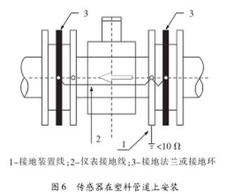 (2)傳感器在塑料管道上或在絕緣襯里的管道上安裝時,如圖6,傳感器兩端必須安裝接地環(huán)或接地法蘭。使管內(nèi)流動的被測介質(zhì)與大地短路,具有零電位,否則污水流量計(jì)無法正常工作。