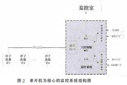 浮子流量計監(jiān)控系統(tǒng)主要功能是模擬量采集輸出, 數(shù)字量采集輸出,由核心模塊進行分析、處理、存儲并和上位機通信。工業(yè)上常用的監(jiān)控系統(tǒng),從組成結(jié)構(gòu)來看主要分為PLC為核心的監(jiān)控系統(tǒng)、現(xiàn)場總線為核心的監(jiān)控系統(tǒng)、單片機為核心的監(jiān)控系統(tǒng)。本設計主要采用以單片機為核心的監(jiān)控方法,該系統(tǒng)使用廣泛,體積小、功耗低、操作方便、設計簡便、成本低,是許多小型監(jiān)控系統(tǒng)的*選。單片機為核心的監(jiān)控系統(tǒng)結(jié)構(gòu)如圖2所示。本監(jiān)測系統(tǒng)主要包括現(xiàn)場浮子流量計組、485總線、主控制板MCU 以及模擬數(shù)字輸出控制模塊。