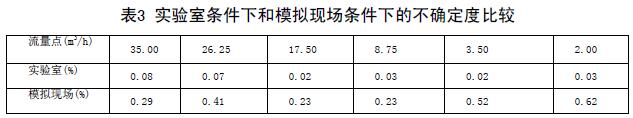 實(shí)驗(yàn)室條件下和模擬現(xiàn)場(chǎng)條件下的不確定度比較(表3)兩次結(jié)果可以看出,兩次實(shí)驗(yàn)各個(gè)流量點(diǎn)的不確定度差距非常大。可見,濃硫酸電磁流量計(jì)對(duì)安裝條件還是比較苛刻的。