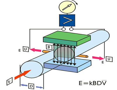當(dāng)導(dǎo)電液體沿測(cè)量管在交變磁場(chǎng)與磁力線成垂直方向運(yùn)動(dòng)時(shí),導(dǎo)電液體切割磁力線產(chǎn)生感應(yīng)電勢(shì)。在與測(cè)量管軸線和磁力線相互垂直的管壁上安裝了一對(duì)檢測(cè)電極,將這個(gè)感應(yīng)電勢(shì)檢出。