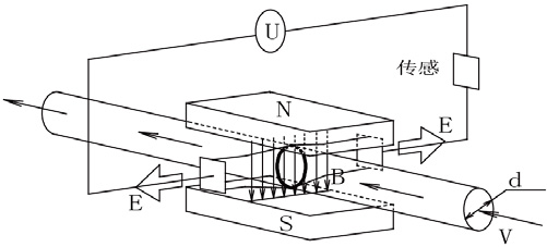 如圖,測量流量時(shí),流體流過垂直于流動方向的磁場,導(dǎo)電性流體的流動感應(yīng)出一個與平均流速成正比的電勢。其感應(yīng)電壓信號通過兩個電極檢出,并通過電纜傳送至轉(zhuǎn)換器,經(jīng)過信號處理及相關(guān)運(yùn)算后,將累計(jì)流量和瞬時(shí)流量顯示在轉(zhuǎn)換器的顯示屏上。