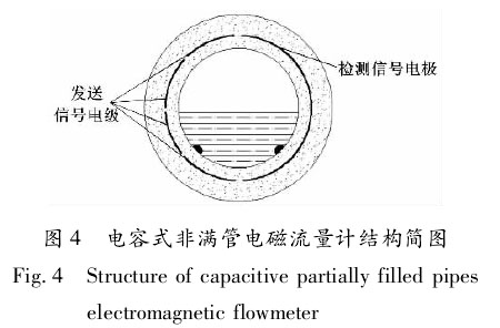 ②電容式非滿管污水廠出水用電磁流量計h。電容式非滿管污水廠出水用電磁流量計結構簡圖如圖4所示。、檢測信號電極  發(fā)送信號電