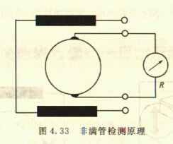非滿管檢測也是基于電導率檢側的方法。在圖4.33所示的電磁流量傳感器中,增加了一個(或一對)非滿管檢測電極。當導管內液體滿管時,頂部電極與其他電極之間的電阻值很小;而當存在非滿管情況時,頂部電極與導電液體之間有氣體阻隔,所以電極電阻顯著增大,從而做出非滿管判斷。