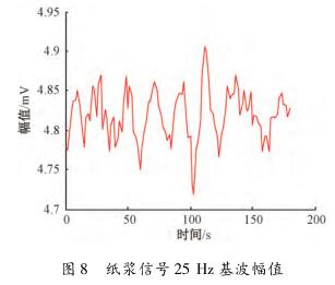 在頻域中對紙漿信號觀察時發(fā)現(xiàn),紙漿信號的漿液噪聲頻帶在零頻率點附近,距離流量信號基波頻率點較遠(yuǎn),對基波幅值和各奇次諧波幅值基本沒有影響,紙漿信號在頻域中的圖形如圖7所示。選擇一組采集的紙漿信號,把其等分成數(shù)段,利用MATLAB計算每段數(shù)據(jù)在基波處的幅值并提取保存在一個數(shù)組中,使用繪圖工具畫出來,如圖8所示??梢姡ǚ翟?.7~4.95mV變化,波動較小。因此,提取到的與流量相關(guān)的感應(yīng)電動勢信號幅值會比較穩(wěn)定。