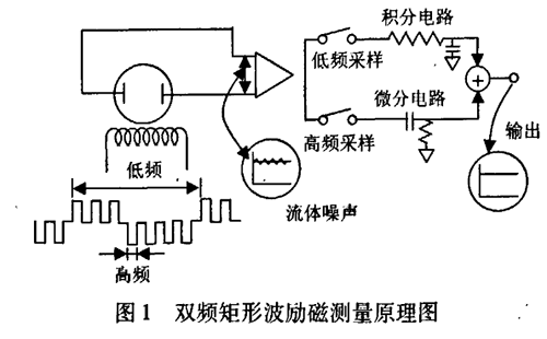 雙頻矩形波勵(lì)磁測(cè)量原理如圖l所示,一個(gè)由高低頻分量迭加而成的電磁場(chǎng)通過勵(lì)磁線圈被施加到被測(cè)液體中,勵(lì)磁波形是在一個(gè)低頻矩形波上迭加一個(gè)高于市電頻率的矩形波而得到的波形。在產(chǎn)生的電動(dòng)勢(shì)中,低頻分量通過一個(gè)大時(shí)間常數(shù)的積分電路獲得一個(gè)零點(diǎn)穩(wěn)定性好的平穩(wěn)流量信號(hào)。而由漿液或低電導(dǎo)率流體產(chǎn)生的低頻噪聲可被不受噪聲影響的高頻采樣電路所抑制,有著同樣時(shí)間常數(shù)的流量信號(hào)經(jīng)過一個(gè)差分電路以確定流速信號(hào)的變化,把這兩種不同頻率采樣所得的信號(hào)結(jié)合起來可獲得一個(gè)穩(wěn)定流速信號(hào),該信號(hào)不受噪聲干擾,且有較高的零點(diǎn)穩(wěn)定性。
