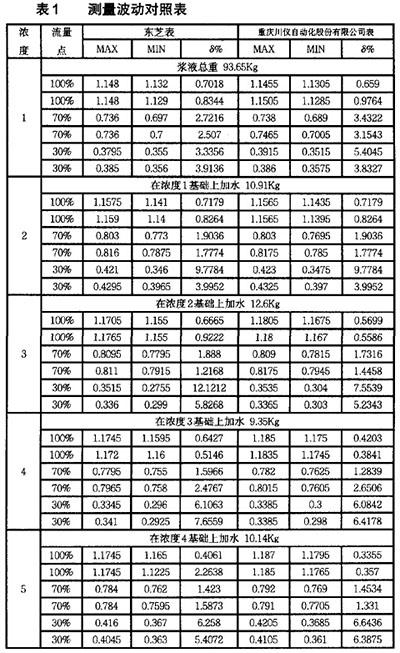 在造紙行業(yè)有大量的紙漿液體需要測(cè)量,就會(huì)用到大量的流量測(cè)量?jī)x表,目前在造紙行業(yè)中用于測(cè)量流量的儀表,主要有防腐濃硫酸電磁流量計(jì)等儀表,因?yàn)?strong>防腐濃硫酸電磁流量計(jì)具有非常強(qiáng)的優(yōu)點(diǎn),所以非常適合在紙漿的流量測(cè)量中使用。在紙漿實(shí)驗(yàn)裝置上,使用串聯(lián)在同一管道上該公司生產(chǎn)的漿液型防腐濃硫酸電磁流量計(jì)與日本東芝的漿液型防腐濃硫酸電磁流量計(jì)測(cè)量不同濃度和流量的紙漿漿液,以驗(yàn)證其可靠性。波動(dòng)率對(duì)比實(shí)驗(yàn)結(jié)果表明,該產(chǎn)品用于紙漿漿液測(cè)量時(shí)能夠很好地克服漿液噪聲。在滿流量測(cè)量時(shí),上述實(shí)驗(yàn)中各濃度下漿液測(cè)量穩(wěn)態(tài)波動(dòng)率均在1%以內(nèi);其它流量下測(cè)量時(shí),由于實(shí)驗(yàn)系統(tǒng)主管道上游分流控制流速不穩(wěn),進(jìn)而導(dǎo)致測(cè)量穩(wěn)態(tài)波動(dòng)率相對(duì)較大,甚至達(dá)到近7‰ 但由表1可知,在各種漿液濃度及各流量點(diǎn)下,凱銘儀表有限公司生產(chǎn)的漿液型防腐濃硫酸電磁流量計(jì)的穩(wěn)態(tài)波動(dòng)率始終與日本東芝漿液型防腐濃硫酸電磁流量計(jì)的測(cè)量結(jié)果一致,從而表明實(shí)驗(yàn)系統(tǒng)的測(cè)量結(jié)果能準(zhǔn)確反映實(shí)際漿液流量大小。 說(shuō)明:MAX、MIN分別表示該組數(shù)據(jù)測(cè)得流速的的*大值和*小值,單位m/s。