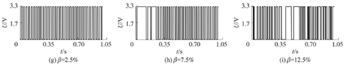 試驗發(fā)現(xiàn),氣相的加入對過熱蒸汽流量計測量的影響顯著,譜分析和脈沖計數(shù)兩種方法隨著氣相注入的增加其表現(xiàn)也不同。圖4反映了水流量12m3/h時,注入不同氣含率β時A點的模擬信號,如圖4(a~c)所示;經(jīng)譜分析后得到的頻率值,如圖4(d~f)所示;用脈沖計數(shù)方法得到的脈沖信號,如圖4(g~i)所示。圖4顯示,當注入氣量不大時,對過熱蒸汽流量計的影響不大,無論是譜分析結果還是脈沖計數(shù)得到的結果都比較好。當注入的氣量進一步增加時,渦街原始信號強度和穩(wěn)定性逐漸變差,渦街頻率信號會被干擾信號所淹沒,反映到譜分析圖是,渦街頻率的譜能量減小,干擾信號的譜能量加強;對于脈沖信號,會因為一些旋渦信號減弱,形成脈沖缺失現(xiàn)象,而不能真實地反映渦街產(chǎn)生的頻率。