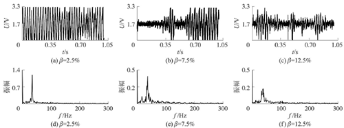 試驗發(fā)現(xiàn),氣相的加入對乙烯流量計測量的影響顯著,譜分析和脈沖計數(shù)兩種方法隨著氣相注入的增加其表現(xiàn)也不同。圖4反映了水流量12m3/h時,注入不同氣含率β時A點的模擬信號,如圖4(a~c)所示;經(jīng)譜分析后得到的頻率值,如圖4(d~f)所示;用脈沖計數(shù)方法得到的脈沖信號,如圖4(g~i)所示。圖4顯示,當(dāng)注入氣量不大時,對乙烯流量計的影響不大,無論是譜分析結(jié)果還是脈沖計數(shù)得到的結(jié)果都比較好。當(dāng)注入的氣量進一步增加時,渦街原始信號強度和穩(wěn)定性逐漸變差,渦街頻率信號會被干擾信號所淹沒,反映到譜分析圖是,渦街頻率的譜能量減小,干擾信號的譜能量加強;對于脈沖信號,會因為一些旋渦信號減弱,形成脈沖缺失現(xiàn)象,而不能真實地反映渦街產(chǎn)生的頻率。