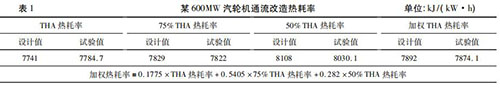 隨著火電機(jī)組利用小時(shí)數(shù)降低,發(fā)電企業(yè)一般都會(huì)根據(jù)不同負(fù)荷工況下的實(shí)際運(yùn)行小時(shí)數(shù),確定機(jī)組熱耗率考核權(quán)重,形成*終的加權(quán)熱耗率考核值??己思訖?quán)熱耗率對(duì)設(shè)備廠家末級(jí)葉片選型、高壓調(diào)門(mén)與高壓缸匹配性提出了更高的要求,在當(dāng)前負(fù)荷率偏低的情況下增強(qiáng)了發(fā)電企業(yè)的競(jìng)爭(zhēng)力。然而,僅僅對(duì)加權(quán)熱耗率進(jìn)行考核是不夠的,設(shè)備廠家為了增強(qiáng)自身的競(jìng)爭(zhēng)力,往往會(huì)把全部重點(diǎn)放在如何降低占比大的低負(fù)荷熱耗率上而犧牲高負(fù)荷的熱耗率,這無(wú)疑削弱了發(fā)電企業(yè)的適應(yīng)性。某廠一臺(tái) 600MW 汽輪機(jī)通流改造時(shí)僅對(duì)加權(quán)熱耗率進(jìn)行考核,THA 熱耗率要高出設(shè)計(jì)值43. 7 kJ/( kW·h) ,詳見(jiàn)表 1。通流改造時(shí)既要對(duì)加權(quán)熱耗率進(jìn)行考核,也要對(duì) THA工況時(shí)熱耗率進(jìn)行考核。
