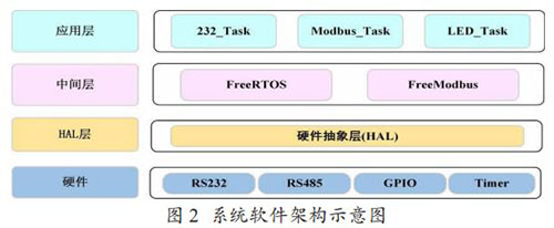 Modbus 通訊模塊的軟件架構(gòu)如圖 2 所示,分為硬件層、硬件抽象層,中間層和應(yīng)用層。中間層包括一個實時操作系統(tǒng)FreeRTOS 和一個針對嵌入式環(huán)境開發(fā)的輕量級 Modbus 協(xié)議庫Freemodbus。在應(yīng)用層,主要創(chuàng)建了三個任務(wù),232_Task 負(fù)責(zé)讀 取和解析流量計表頭輸出的文本信息,Modbus_Task 負(fù)責(zé)存儲 解析后的流量計數(shù)據(jù)到 Modbus 寄存器表,以及以 Modbus 協(xié)議與取水監(jiān)測設(shè)備通信,LED_Task 是一個輔助任務(wù),主要用來提示程序運行狀態(tài)。