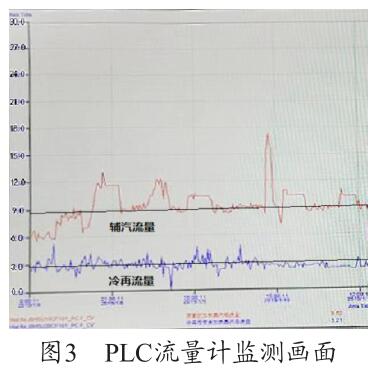 通過(guò)圖3 PLC 流量計(jì)監(jiān)測(cè)畫(huà)面可以看出,PLC 上輔汽測(cè)量用的沼氣流量計(jì)的量程設(shè)置為30t/h,現(xiàn)場(chǎng)設(shè)備量程實(shí)際為6t/h,兩者嚴(yán)重不符,因此測(cè)量值4t/h 為錯(cuò)誤值(單臺(tái)機(jī)組運(yùn)行),需要對(duì)程序進(jìn)行修改。