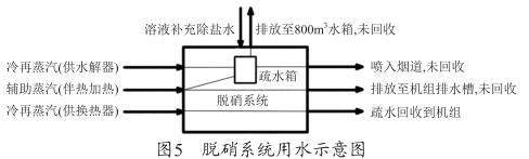 從圖5可以看出,脫硝系統(tǒng)所使用的冷再蒸汽和輔助蒸汽換熱后全部冷凝為疏水,供水解器的蒸汽和部分伴熱加熱的蒸汽回收至脫硝系統(tǒng)的疏水箱,部分伴熱蒸汽疏水直接排放至機(jī)組排水槽,未進(jìn)行回收。疏水箱的水一部分被脫硝系統(tǒng)利用,另一部分排放至機(jī)組800m 3 水箱,未進(jìn)行回收。下面結(jié)合耗水量對(duì)蒸汽耗量進(jìn)行判斷 :