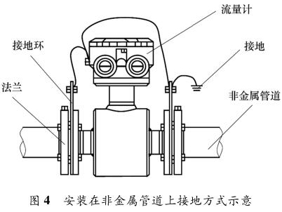 防腐型電磁流量計安裝在金屬管道上,安裝時將金屬管道與防腐型電磁流量計相連接,接地線再接入接地網(wǎng),如圖 3 所示。
