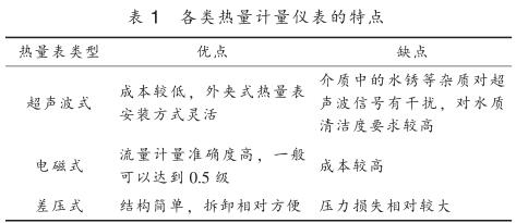 目前供熱行業(yè)內(nèi)使用的熱量計(jì)量?jī)x表按工作原理主要分為超聲波式、 電磁式、 差壓式, 其特點(diǎn)見表 1 。 熱量計(jì)量?jī)x表按結(jié)構(gòu)可分為一體式和分體式, 一體式熱量表將一支入口或出口溫度傳感器嵌入到流量傳感器管道中, 并配有專門的計(jì)算器進(jìn)行熱量計(jì)算; 分體式熱量表采用單獨(dú)的流量傳感器, 包括超聲波流量計(jì)、 電磁流量計(jì)、 差壓流量計(jì)、硝酸鈉流量計(jì)等, 溫度測(cè)量采用單獨(dú)的鉑電阻溫度計(jì)或溫度變送器測(cè)量供回水管道溫度, 再配備熱量積算儀進(jìn)行溫度和流量信號(hào)采集得到熱量值。