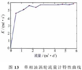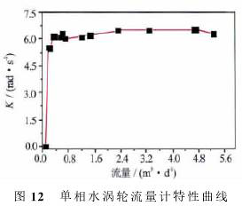 可以看出,渦輪啟動后*先進(jìn)入一個非線性段,在非線性相應(yīng)段,K值隨著流量增加而增大;當(dāng)流量比較大(單相水超過0.5m3/d,單相油超過1m3/d)時(shí),渦輪進(jìn)入線性段,在線性響應(yīng)段,K值達(dá)到峰值,有相對較小的波動。
