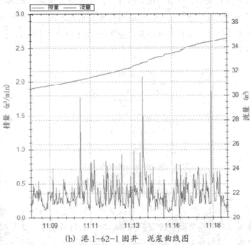 從圖2中可以看出,水泥漿排量曲線比較穩(wěn)定,紋波為0.05 m3/min,基本可以認(rèn)為是渦輪的偶發(fā)跳動(dòng)或者采集設(shè)備的紋波導(dǎo)致,水泥漿的累積流量基本形成一條直線上升。泥漿排量本應(yīng)該是0 m3/min,實(shí)際曲線上可以看出很不穩(wěn)定,從11: 03: 53之后,非常大能夠達(dá)到1.06 m3/min,一眼看過(guò)去就會(huì)感覺(jué)是雜亂無(wú)章的波形,泥漿的累積流量本應(yīng)該是一條水平線.結(jié)果變成了一條不規(guī)則的斜線。