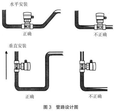 現(xiàn)場安裝時(shí)應(yīng)注意遠(yuǎn)離可能對(duì)其產(chǎn)生干擾的大型設(shè)備,防止長期的熱輻射和其他如磁場直射等環(huán)境影響。為確保高測量精度和較好的零點(diǎn)穩(wěn)定性,進(jìn)行校正前,航空煤油流量計(jì)應(yīng)裝入工藝介質(zhì)中至少 24 小時(shí)電極鈍化。安裝的管路設(shè)計(jì)應(yīng)確保管道始終充滿流體,防止測量誤差,管路設(shè)計(jì)圖見圖 3。