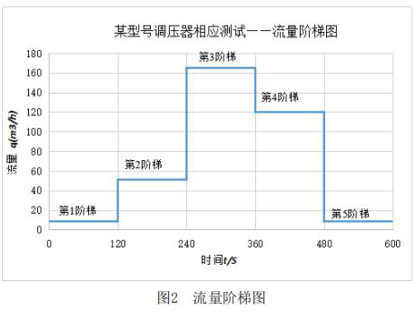 該測(cè)試主要利用實(shí)驗(yàn)室測(cè)試條件,模擬客戶現(xiàn)場(chǎng)使用情況。其主要測(cè)試內(nèi)容包括:測(cè)試電磁流量計(jì)在+23℃,-30℃和-40℃三種溫度下,電磁流量計(jì)出口壓力分別在2.1kPa和30kPa時(shí),流量分別從*1階梯到*5階梯時(shí)的響應(yīng)速度,客戶所提供的流量階梯如圖2所示。橫軸表示下游球閥開啟動(dòng)作時(shí)間,縱軸表示衛(wèi)生級(jí)電磁流量計(jì)下游需要的流量q。