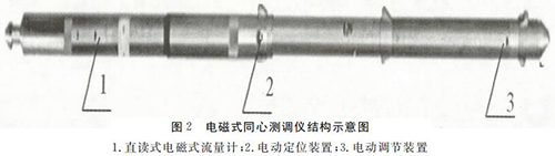 電磁式同心測(cè)調(diào)儀是同心分層注水工藝技術(shù)的關(guān)鍵儀器,其設(shè)計(jì)理念:集成流量測(cè)試與水量調(diào)節(jié)于一體,實(shí)現(xiàn)測(cè)調(diào)同 步;動(dòng)力傳遞設(shè)計(jì)為同心降速機(jī)制,機(jī)械結(jié)構(gòu)簡(jiǎn)單,動(dòng)力傳遞效率高,測(cè)調(diào)穩(wěn)定性高。主要包括以下結(jié)構(gòu),如圖2所示。