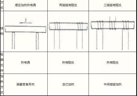 測量管加熱方式大部分產(chǎn)品采用兩繞組或三繞組線繞電阻;除管外電阻絲繞組加熱方式外還有利用管材本身電阻加熱方式,如表1所示。測量管形狀有直管形,還有∏字形結(jié)構(gòu),三繞組中一組在中間加熱,兩組分繞兩臂測量溫度。
