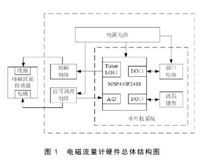 新型固井電磁泥漿流量計(jì)的硬件部分是由電源電路、傳感器、信號采集處理電路、勵磁電路以及接口電路共同組成。如圖 1 所示,為電磁流量計(jì)硬件總體結(jié)構(gòu)。